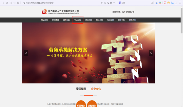 1.登錄陜西秦潤(rùn)人力資源集團(tuán)有限公司官網(wǎng)(網(wǎng)址:http://ecuadorsfinest.com/),點(diǎn)擊“考試報(bào)名”。